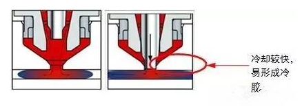 下圖是典型的熱流道噴嘴的結(jié)構(gòu),可以看到,其噴嘴前端與模板接觸,雖然接觸面積有限,噴嘴前端的熱量還是會(huì)向較冷的模板傳導(dǎo);此外,噴嘴周圍由于冷卻的需要,有時(shí)還存在冷卻回路,這樣進(jìn)一步增加噴嘴前端溫度過低的可能性。噴嘴前端的溫度較低,導(dǎo)致其前端存在少部分冷料,特別是封針封膠不嚴(yán)時(shí),熔體溢出,更易形成冷料,因此熱流道噴嘴轉(zhuǎn)冷流道時(shí),建議在冷流道上也設(shè)置冷料井。