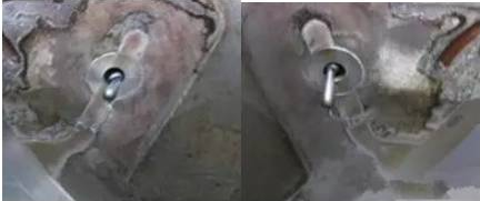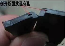 1)制品結(jié)構(gòu)方面:觀察鼓包位于行李箱蓋板兩側(cè)對(duì)應(yīng)圓弧位置,左右兩邊的圓弧都出現(xiàn)鼓包,幾率有所差異;鼓包有時(shí)明顯鼓起,有時(shí)只是輕微的凹凸不平,很難發(fā)現(xiàn),噴漆后非常明顯;采用電吹風(fēng)在600℃下烘烤,輕微的鼓包迅速鼓起。取表面有輕微凹凸不平的產(chǎn)品,剖開斷面都看到有孔。